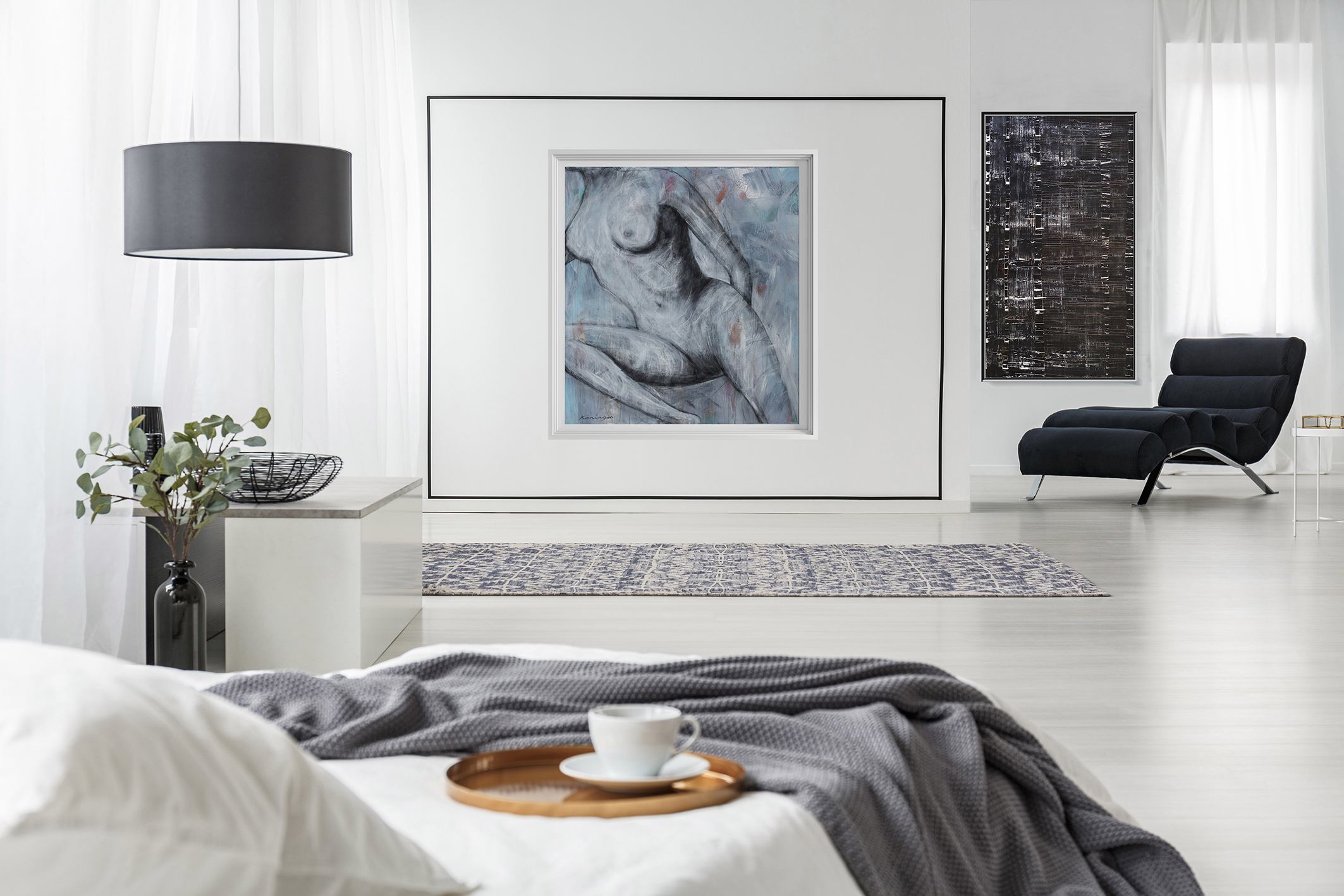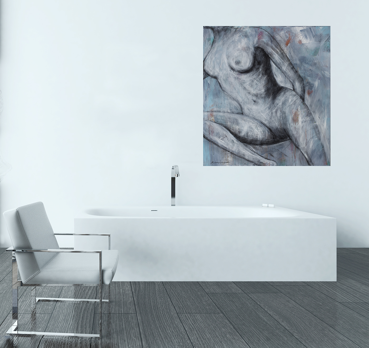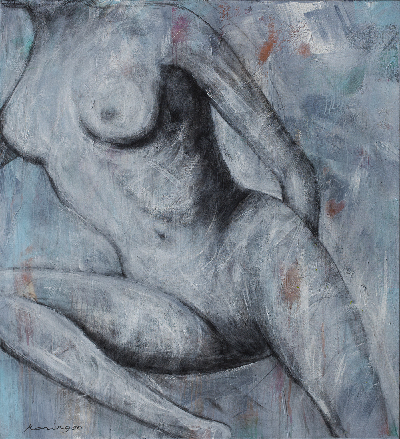 Nude woman on canvas, grey blue colour mixed media, charcoal and acrylic paint.
