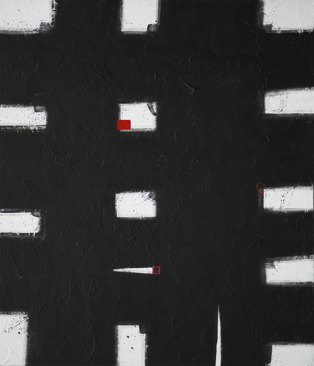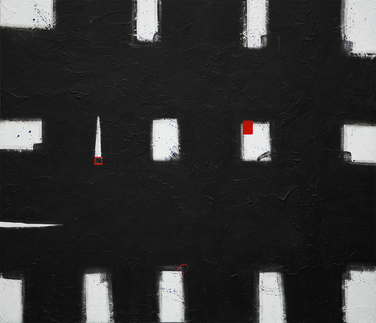 Inspired by a Belted Galloway lonely cow this artwork has a textured leather like finish and small red contrasting blocks of colour.