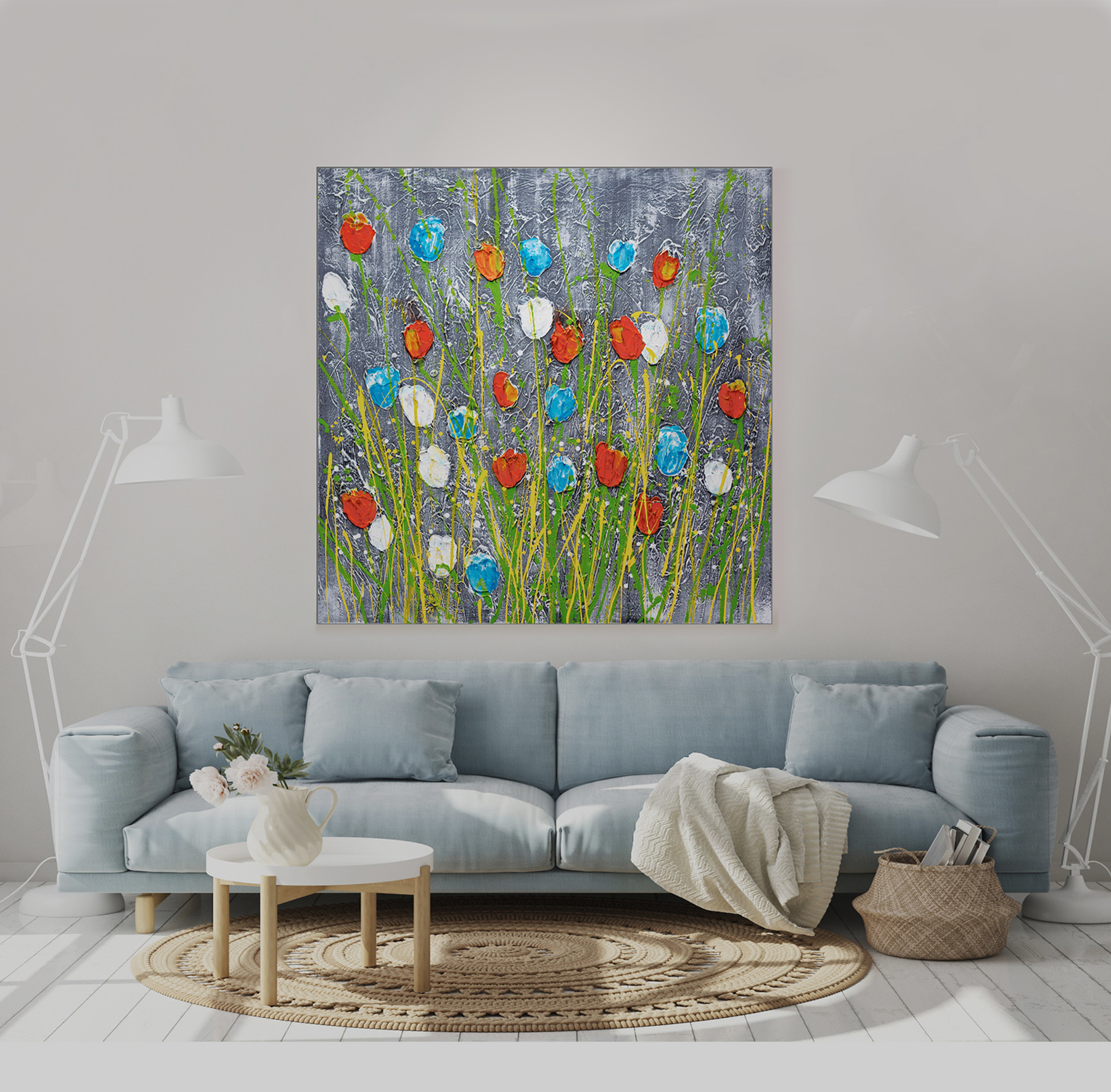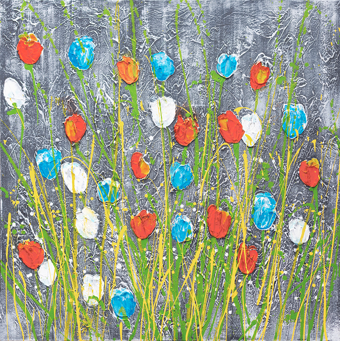 Contemporary painting impressionist field of tulips with a textured background